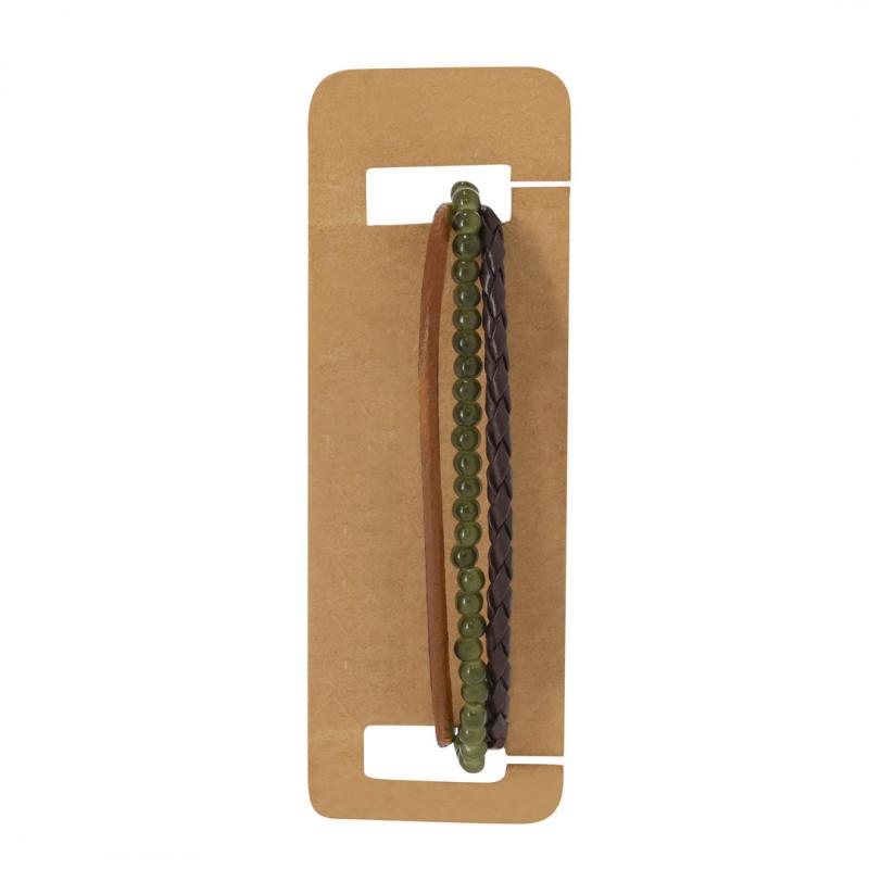 Pulsera confeccionada en piel, diseñada con la combinación de tres cordones: cuero marrón claro con acabado liso, central con cuentas de vidrio en color verde y un tercero de cuero trenzado marrón. Con cierre ajustable de suave algodón encerado. Presentada en cartón kraft con superficie lisa para el marcaje.