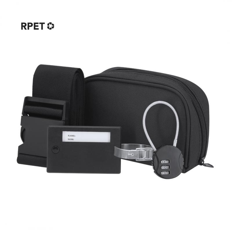 Set de viaje. Incluye: cinta ajustable para maletas, identificador de maletas y candado con contraseña numérica de 3 dígitos y cierre de cable de acero. Presentado en funda de RPET con cierre de cremallera y doble bolsillo interior. Incluye distintivo RPET.El material RPET se elabora a partir de plástico reciclado, para así fomentar la reutilización de residuos plásticos y ayudar a la sostenibilidad del planeta.