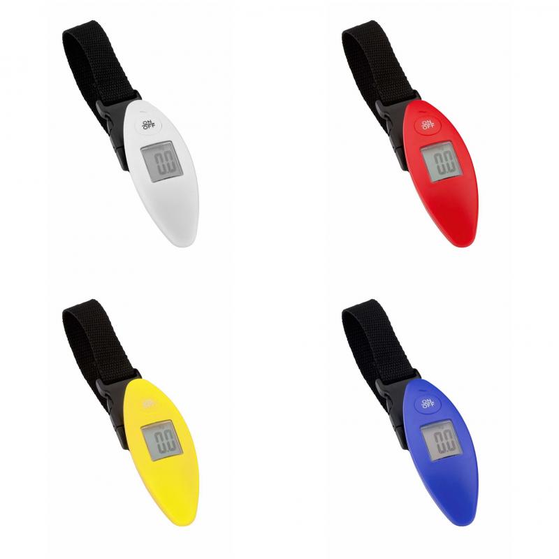 Práctica báscula digital para equipaje en vivos colores. Con pila de botón incluida y peso máximo de 40kg.
