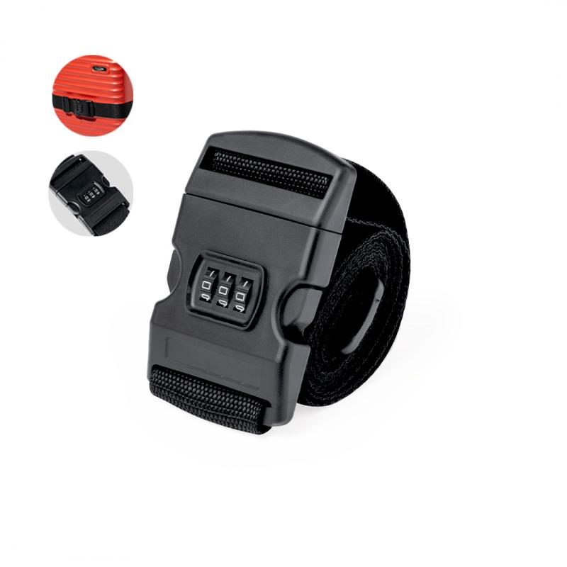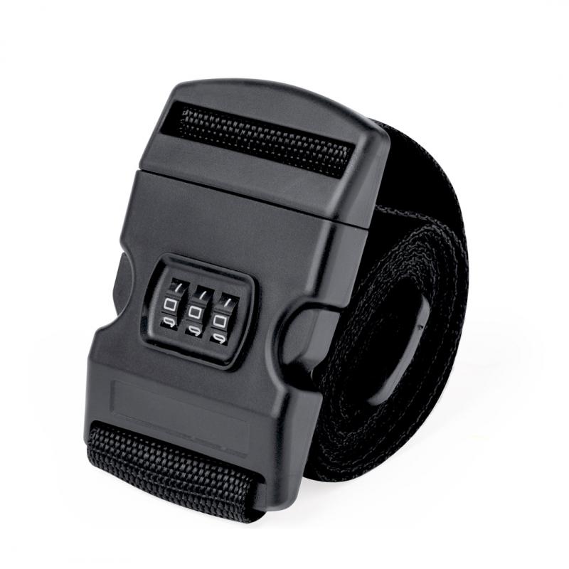 Cinta para maletas ajustable fabricada en resistente poliéster. Con cierre de hebilla ajustable y contraseña de 3 cifras. En discreto color negro y de 200cm de largo. Presentada en una bolsa individual de papel reciclado.