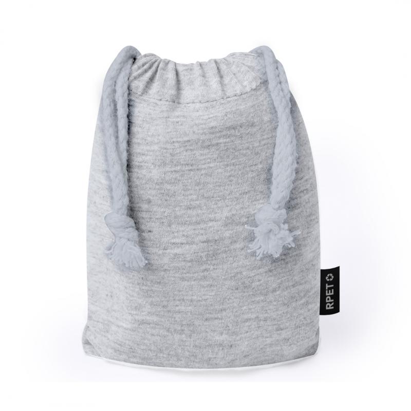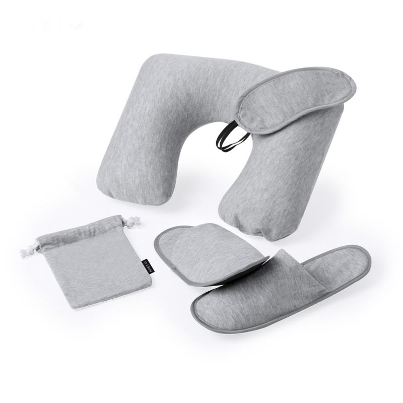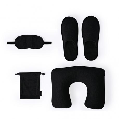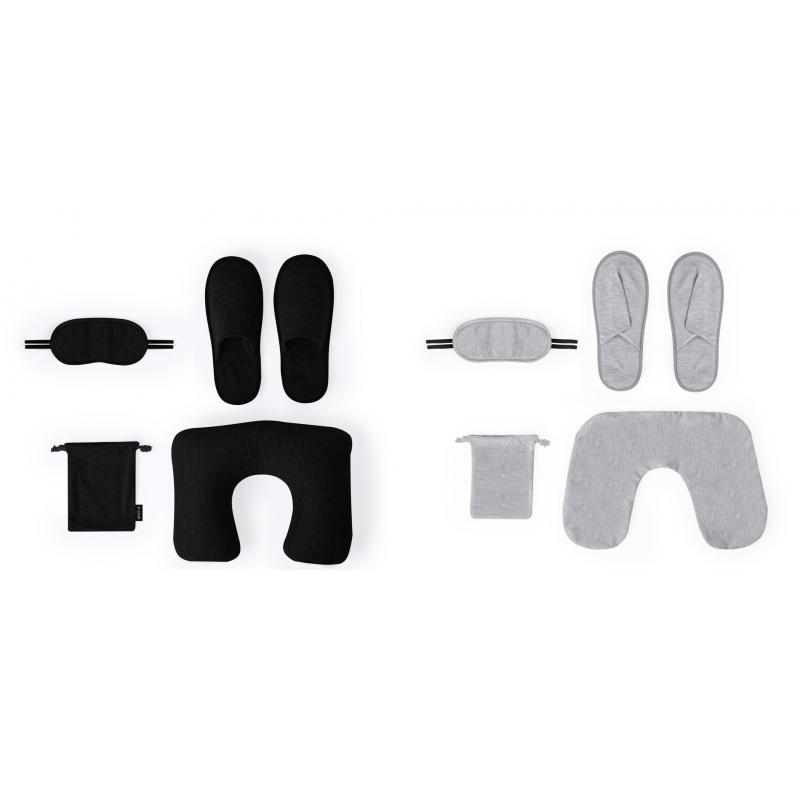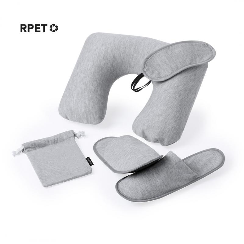 Estupendo set de viaje en suave poliéster. El conjunto incluye: Almohadilla ergonómica para cuello. Suave antifaz con cinta ajustable Zapatillas a conjunto. Fácil de guardar en la funda fabricada en RPET. Disponible en elegantes colores, con logotipo RPET en la funda.El material RPET se elabora a partir de plástico reciclado, para así fomentar la reutilización de residuos plásticos y ayudar a la sostenibilidad del planeta.