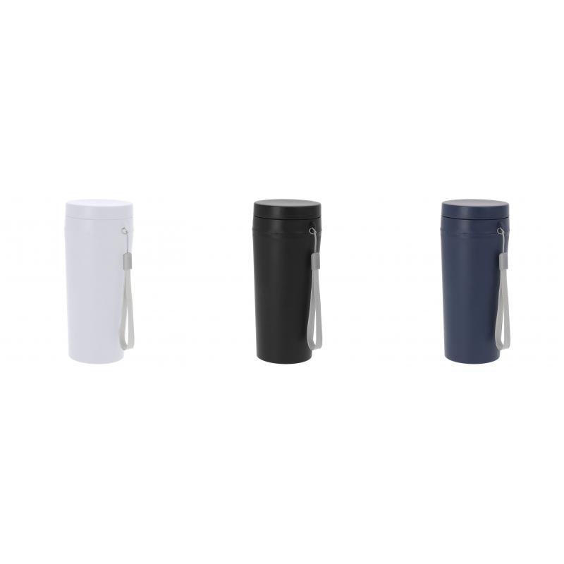 Bidón térmico fabricado en resistente PP Reciclado, con 320ml de capacidad. Con tapón de cierre hermético a rosca y cinta de transporte en color gris. El PP reciclado es un plástico reciclado y altamente reciclable, de gran resistencia y apto para multitud de aplicaciones.